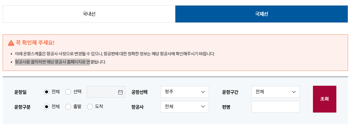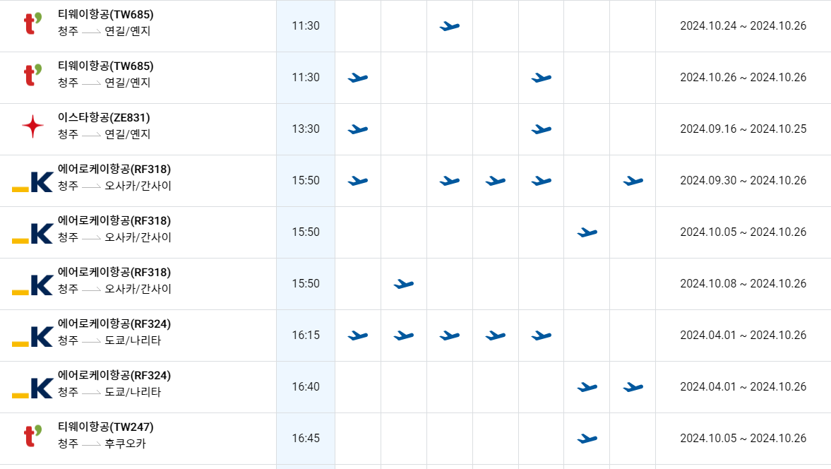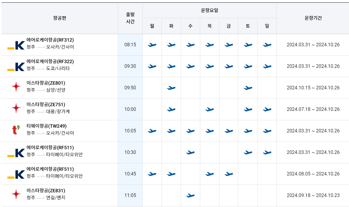청주공항 국제선 노선 운항스케줄